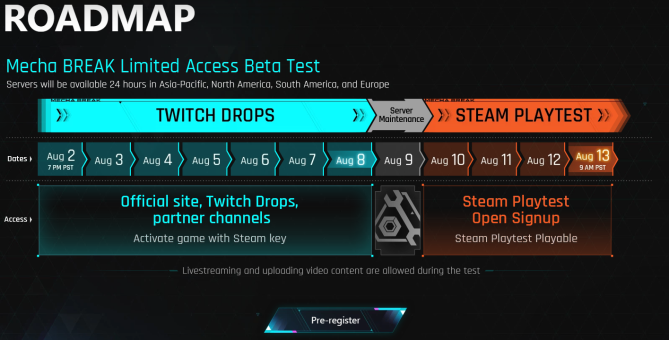 If you got a Steam key between August 2nd and August 8th 2024, either through Twitch Drops or the website, you can play the closed beta on Steam until August 13th. You can find the current Mecha Break roadmap down below.